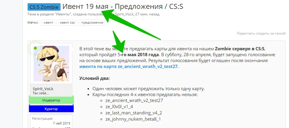 В этой теме вы можете предлагать карты для ивента на нашем Zombie сервере в CS:S, который пройдёт 19-го мая 2018 года. В субботу, 28-го апреля, будет запущено голосование на основе ваших предложений. Результат голосования будет оглашен после окончания ивента по карте ze_ancient_wrath_v2_test27.